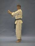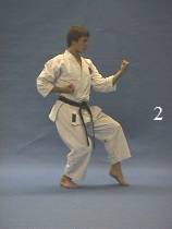 С поворотом через правое плечо на 180 градусов встать в миги-нэкоаси-дати. Выполнить миги-тюдан-ёко-укэ. Левый кулак отдернуть к левому боку.